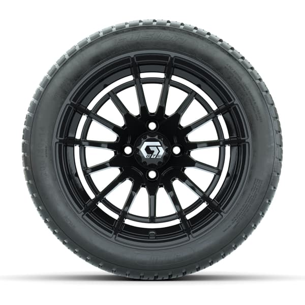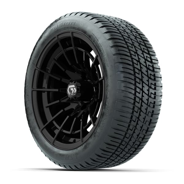 GTW® Boost Gloss Black 14″ wheels with 205/30-14 Fusion Street tires. This complete set includes four low-profile 4-ply tires, color-matched caps, and a sleek design for smooth street or course performance. Lug nuts sold separately.