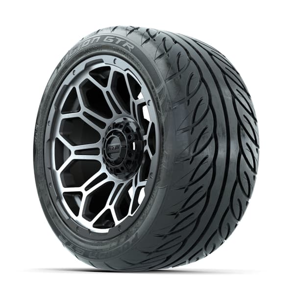 A set of (4) 14-inch GTW® Bravo Machined/Matte Grey golf cart wheels Mounted on 225/40-R14 GTW® Fusion GTR Steel Belted Street Tires