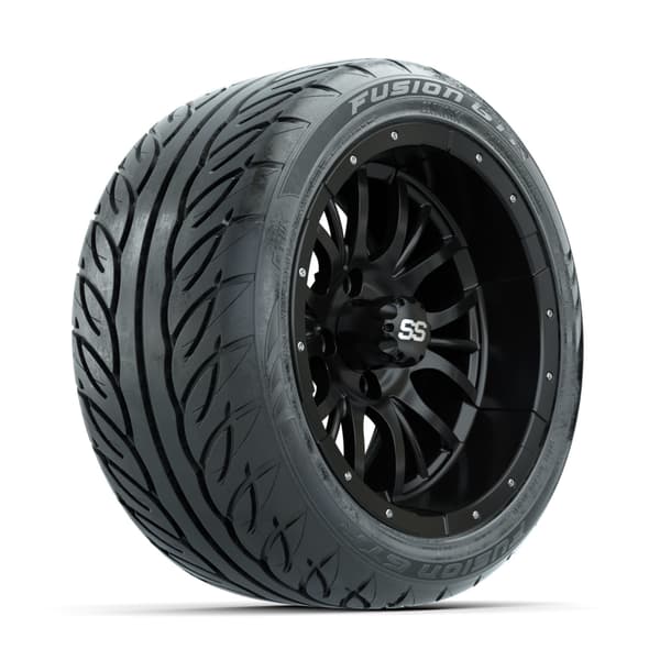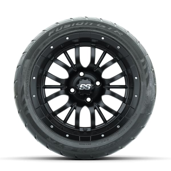 A set of (4) 14-inch GTW® Diesel Matte Black golf cart wheels Mounted on 225/40-R14 GTW® Fusion GTR Steel Belted Street Tires