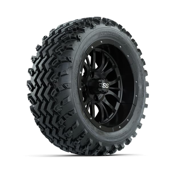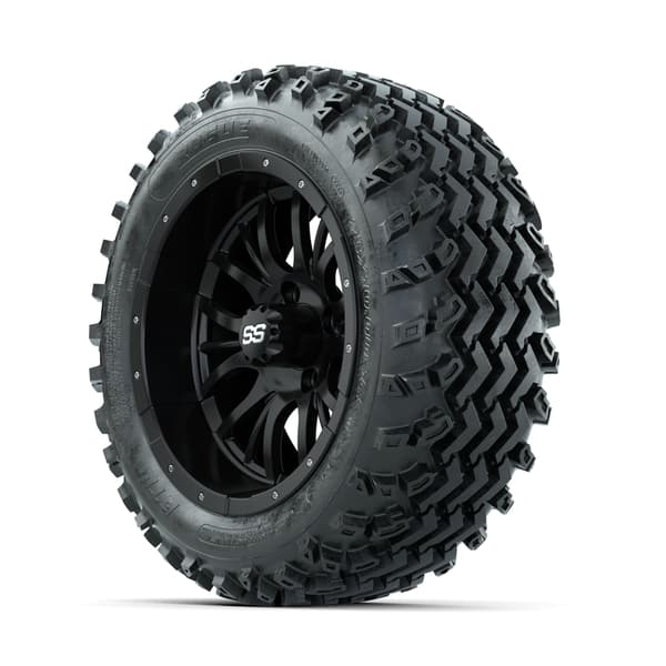 A set of (4) 14-inch GTW® Diesel Matte Black golf cart wheels Mounted on 23×10.00-14 Rogue All-Terrain Tires