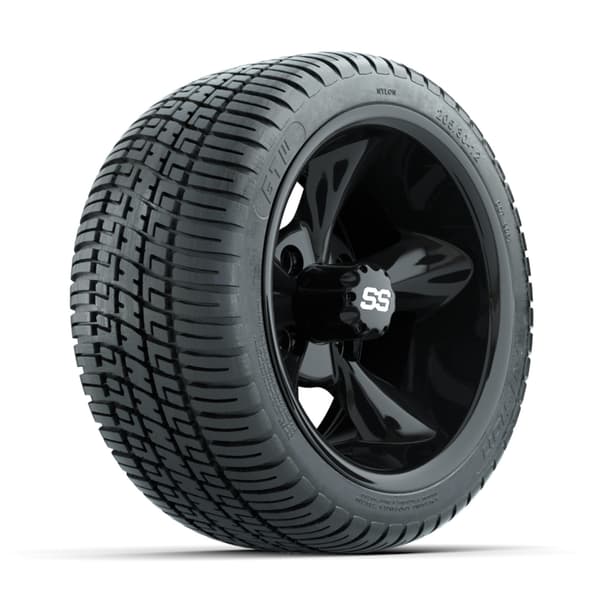 A set of (4) 12-inch GTW® Godfather Black golf cart wheels Mounted on 205/30-12 GTW® Fusion Street Tires