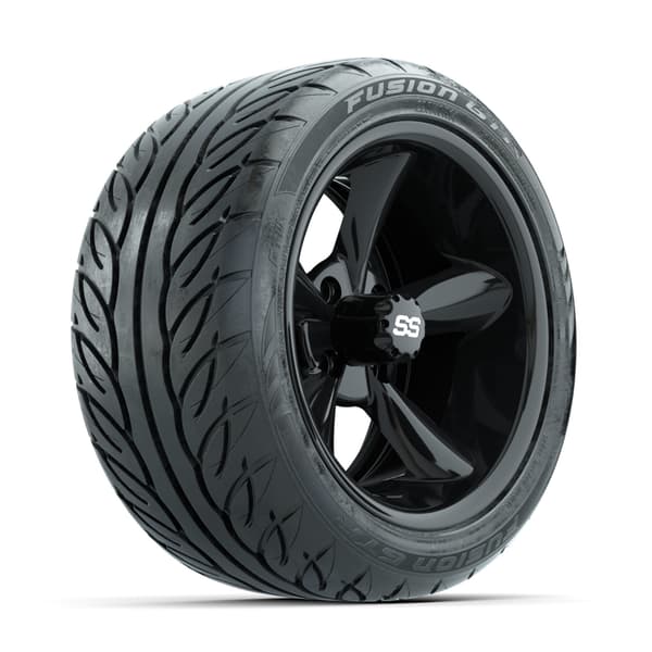 A set of (4) 14-inch GTW® Godfather Black golf cart wheels Mounted on 225/40-R14 GTW® Fusion GTR Steel Belted Street Tires
