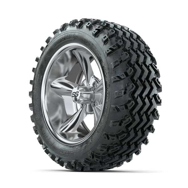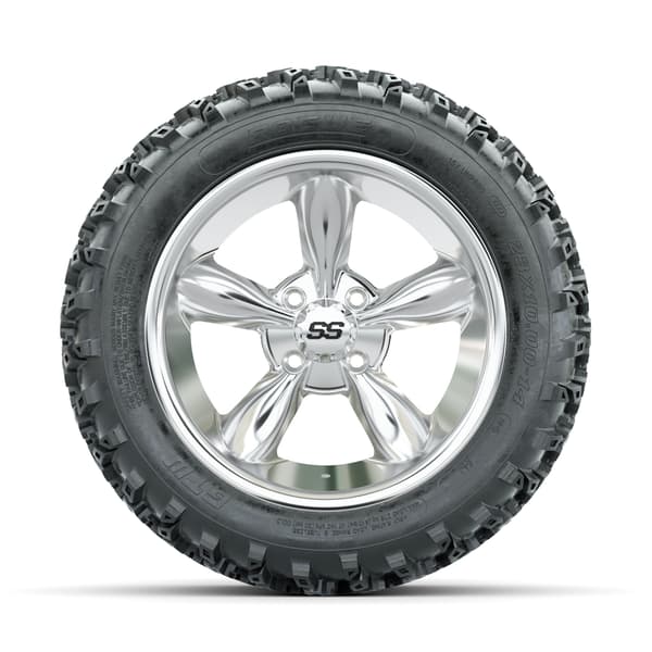 A set of (4) 14-inch GTW® Godfather Chrome golf cart wheels Mounted on 23×10.00-14 Rogue All-Terrain Tires