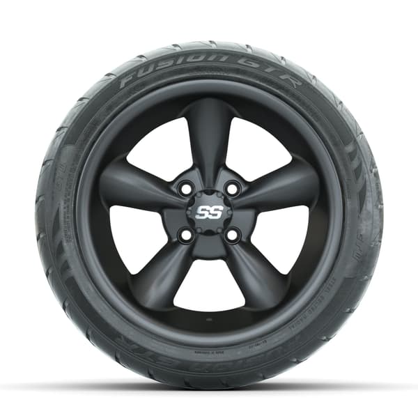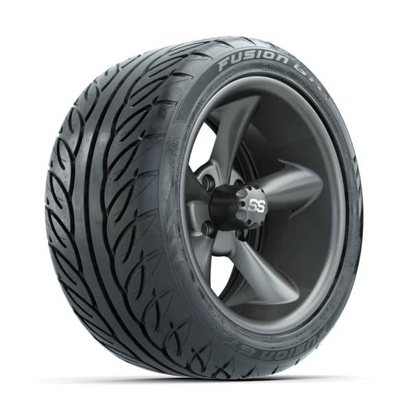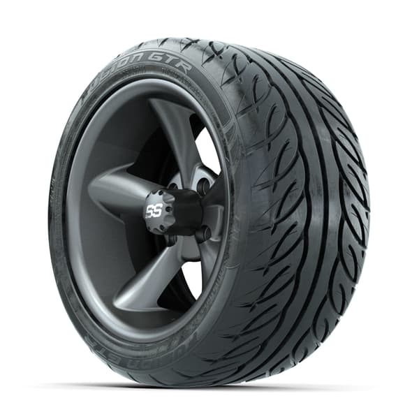 A set of (4) 14-inch GTW® Godfather Matte Grey golf cart wheels Mounted on 225/40-R14 GTW® Fusion GTR Steel Belted Street Tires