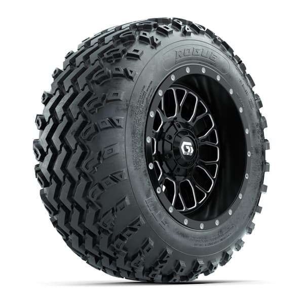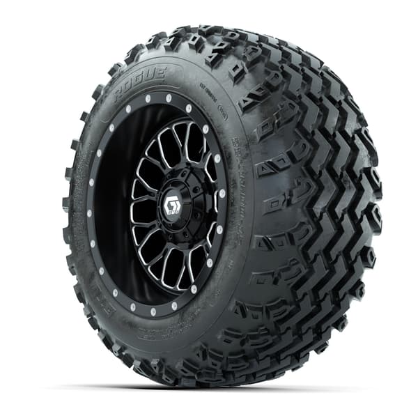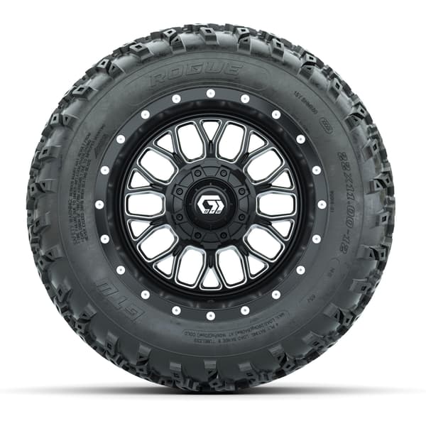 A set of (4) 12-inch GTW® Helix Machined/Black golf cart wheels Mounted on 22×11.00-12 Rogue All-Terrain Tires