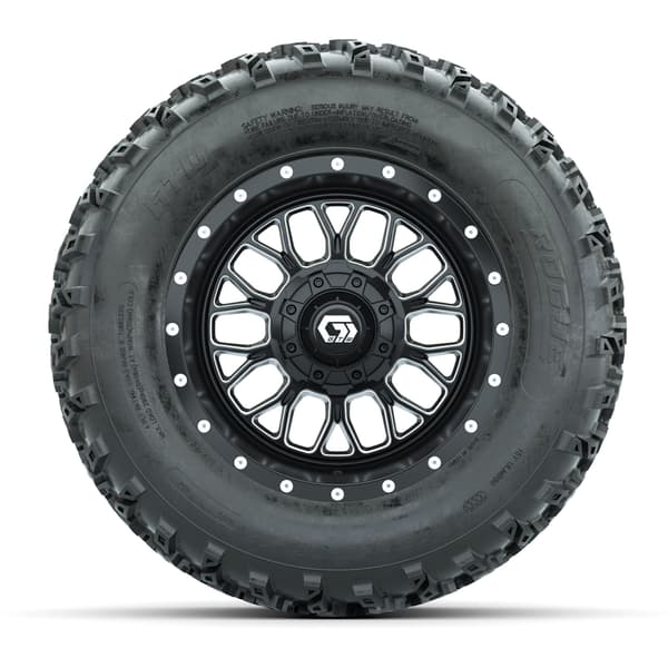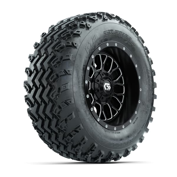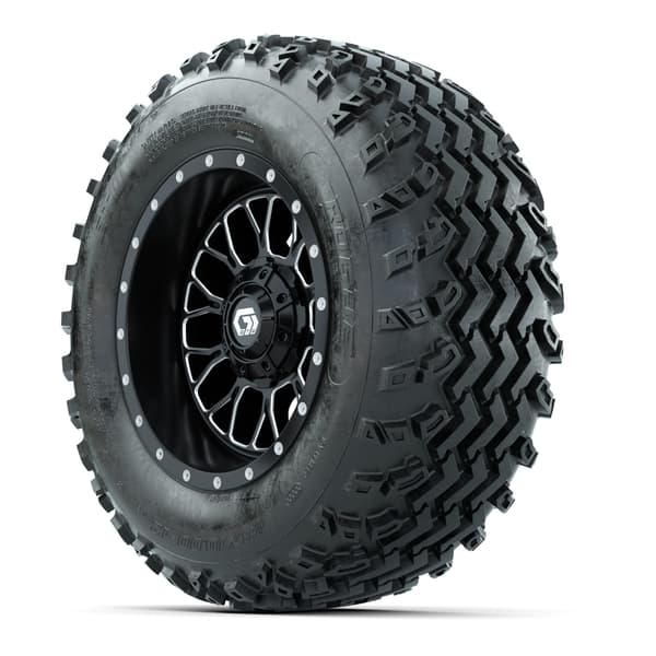 A set of (4) 12-inch GTW® Helix Machined/Black golf cart wheels Mounted on 23×10.00-12 Rogue All-Terrain Tires