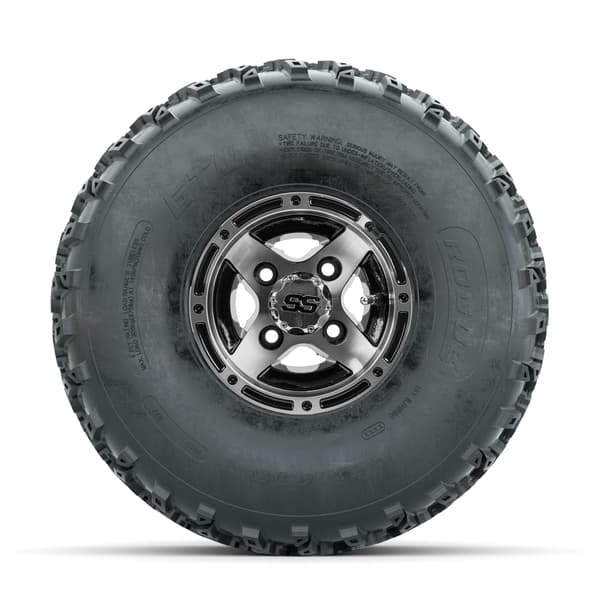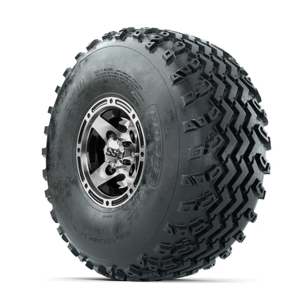 A set of (4) 8-inch GTW® Ranger Machined/Black golf cart wheels Mounted on 22×11.00-8 Rogue All-Terrain Tires