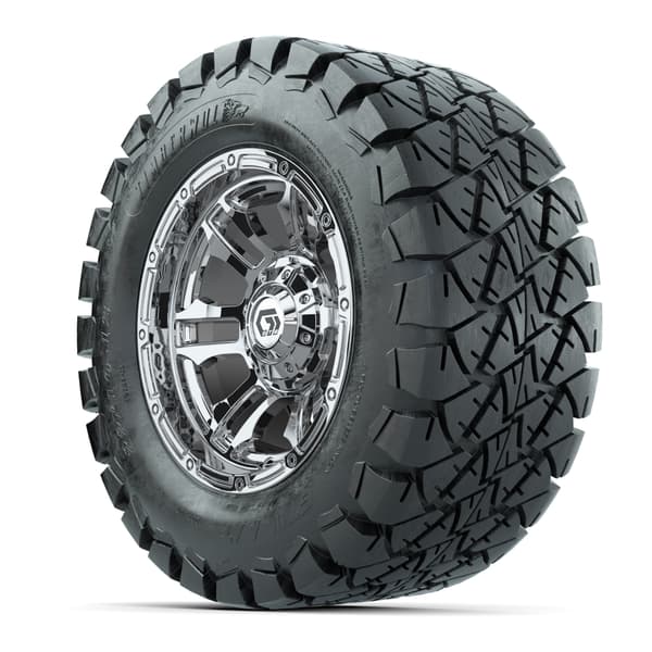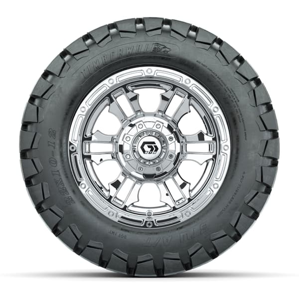 GTW® Shogun Chrome 12″ wheels with 22×10-12 Timberwolf All-Terrain tires. This complete off-road set includes four 4-ply tires, color-matched caps, and rugged tread for dependable traction with a bold chrome finish. Lug nuts sold separately.