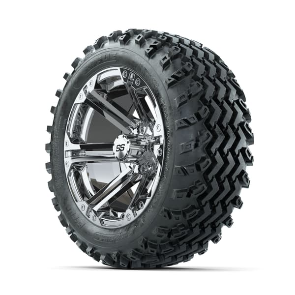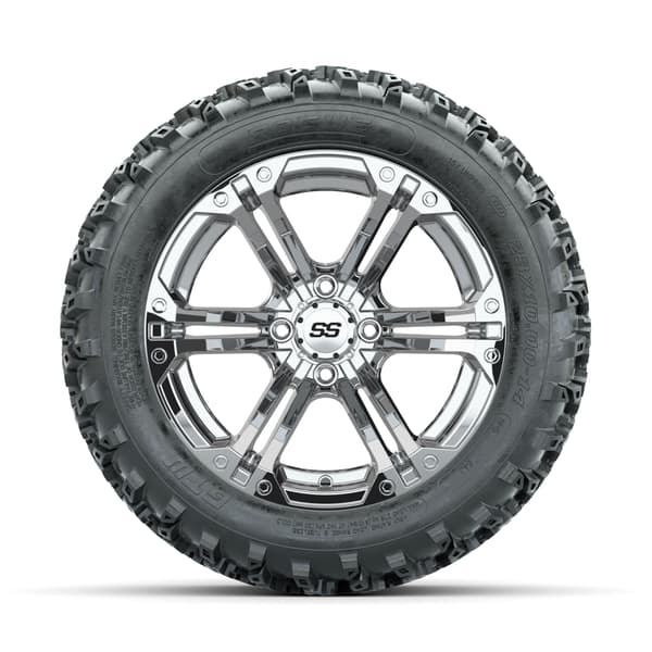 GTW Specter Chrome 14″ wheels with 23×10.00-14 Rogue All-Terrain Tires. Built for off-road and rugged terrain. Includes 4 wheels, 4 tires, and center caps. Requires minimum 3” lift kit. 4×101.6mm lug pattern. Tires mounted and inflated before shipping. Lug nuts sold separately.