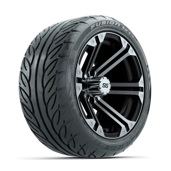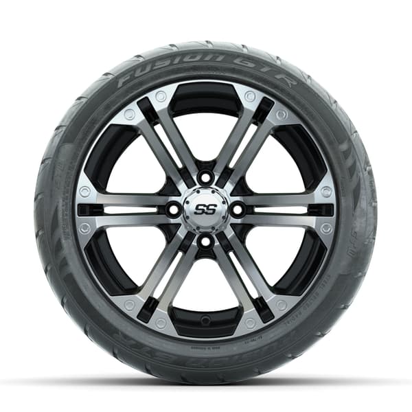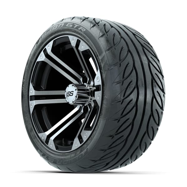 A set of (4) 14-inch GTW® Specter Machined/Black golf cart wheels Mounted on 225/40-R14 GTW® Fusion GTR Steel Belted Street Tires