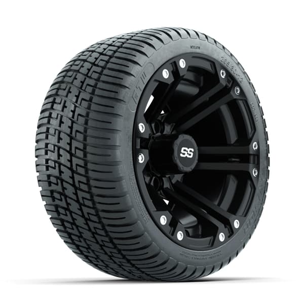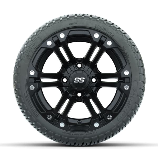 A set of (4) 12-inch GTW® Specter Matte Black golf cart wheels Mounted on 205/30-12 GTW® Fusion Street Tires