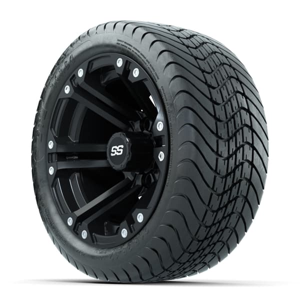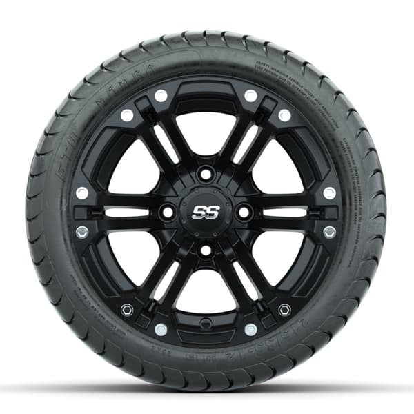 A set of (4) 12-inch GTW® Specter Matte Black golf cart wheels Mounted on 215/35-12 GTW® Mamba Street Tires