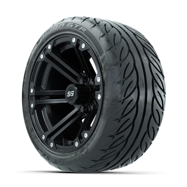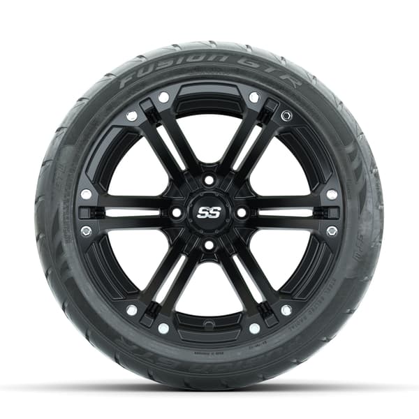 A set of (4) 14-inch GTW® Specter Matte Black golf cart wheels Mounted on 225/40-R14 GTW® Fusion GTR Steel Belted Street Tires