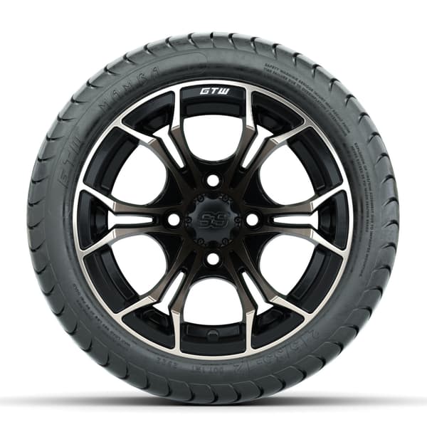 A set of (4) 12-inch GTW® Spyder Bronze/Matte Black golf cart wheels Mounted on 215/35-12 GTW® Mamba Street Tires