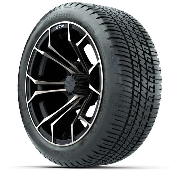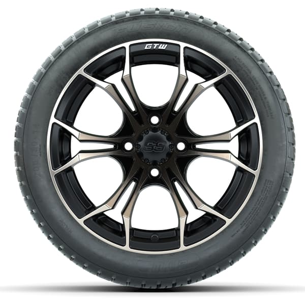 Set of (4) 14″ GTW Spyder Bronze/Matte Black Wheels with 205/30-14 Fusion Street Tires. Matte black and bronze finish with 19″ low-profile tires, pre-mounted for street, turf, or course use. No lift kit required for most carts. 4×101.6mm lug pattern. Lug nuts sold separately.