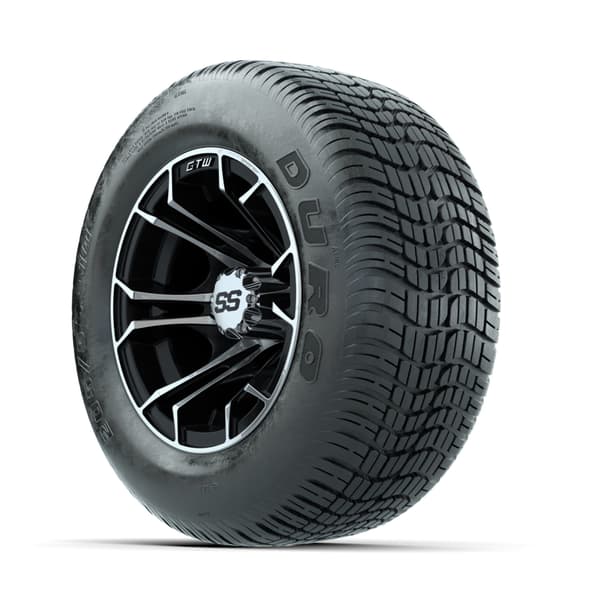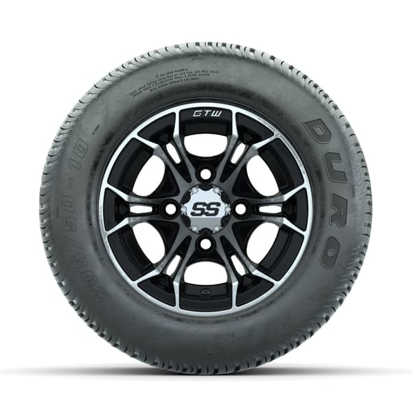 A set of (4) 10-inch GTW® Spyder Machined/Black golf cart wheels Mounted on 205/50-10 Duro Low-profile Tires