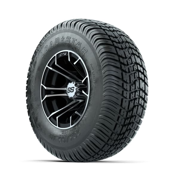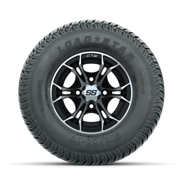 A set of (4) 10-inch GTW® Spyder Machined/Black golf cart wheels Mounted on 205/65-10 Kenda Load Star Street Tires