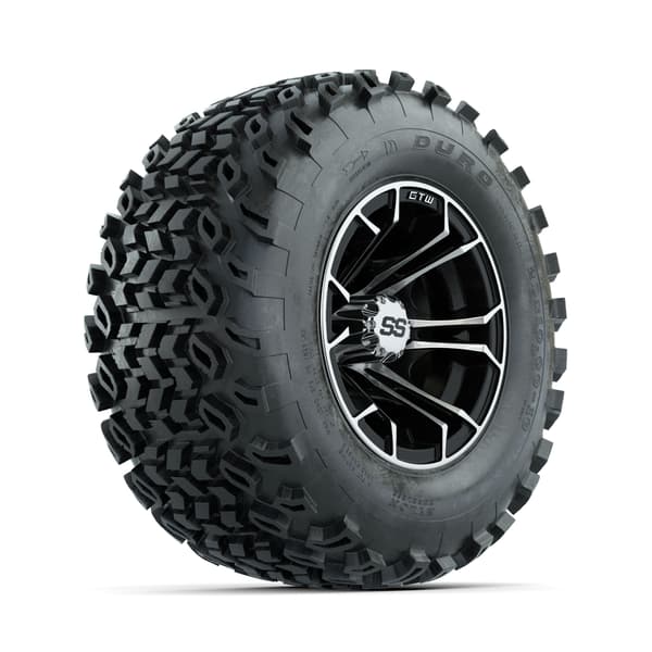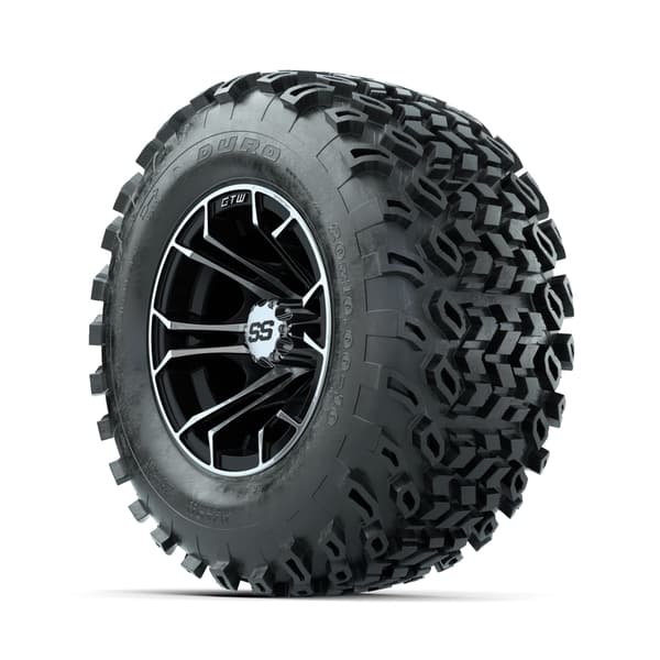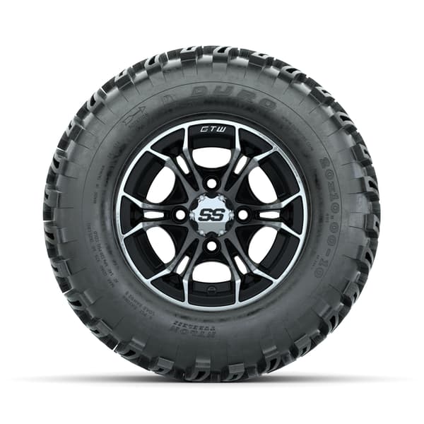 A set of (4) 10-inch GTW® Spyder Machined/Black golf cart wheels Mounted on 20×10-10 Duro Desert All Terrain Tires