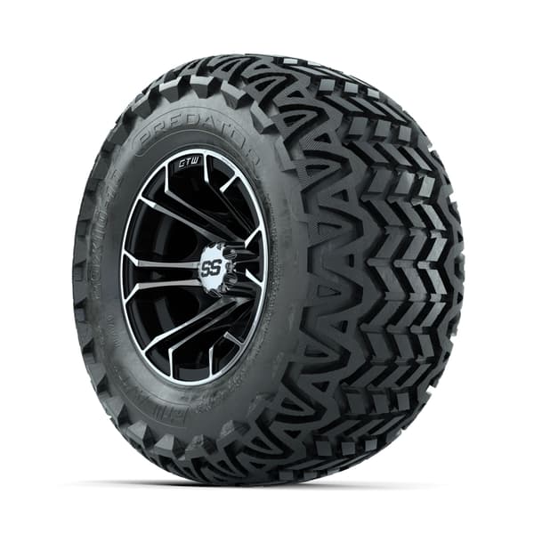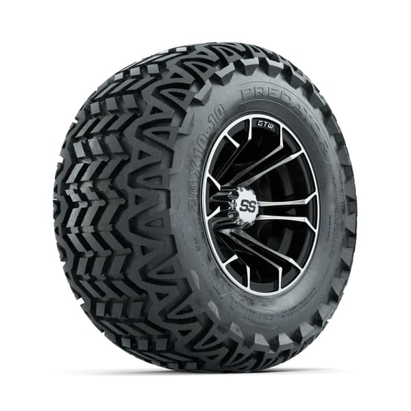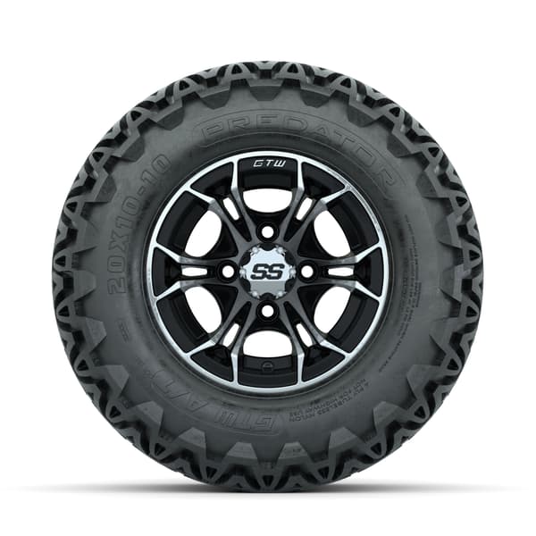 A set of (4) 10-inch GTW® Spyder Machined/Black golf cart wheels Mounted on 20×10-10 Predator All-Terrain Tires