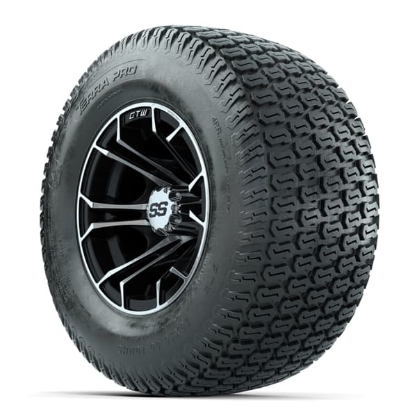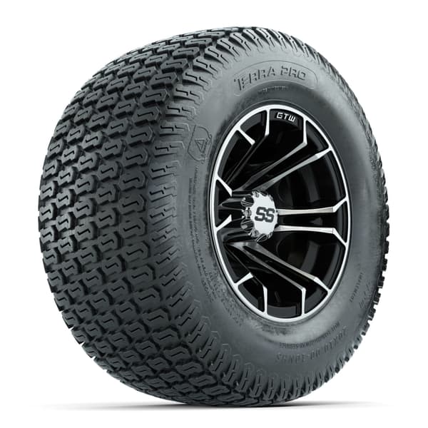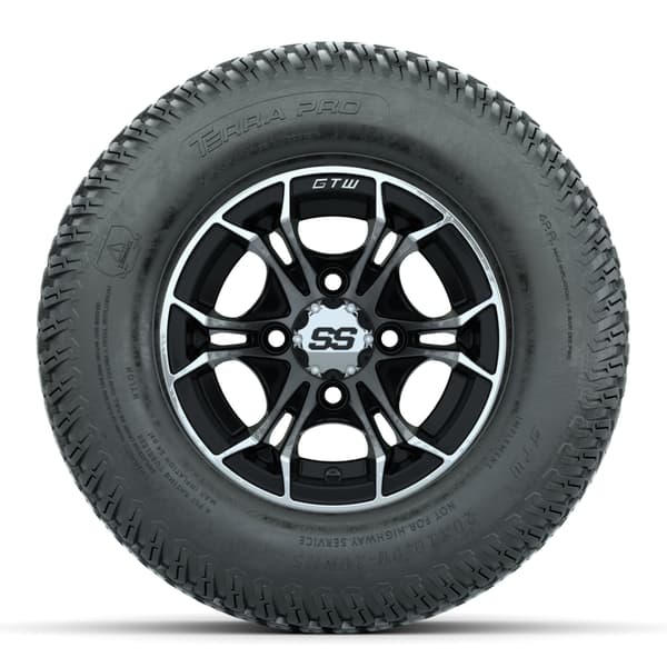 A set of (4) 10-inch GTW® Spyder Machined/Black golf cart wheels Mounted on 20×10-10 Terra Pro S-Tread Traction Tires
