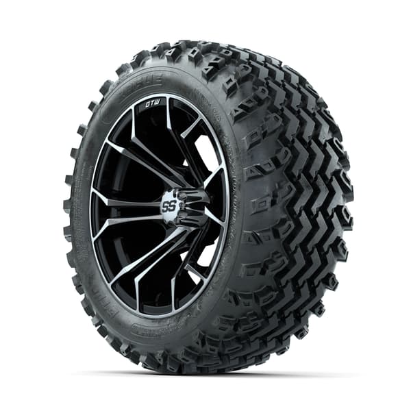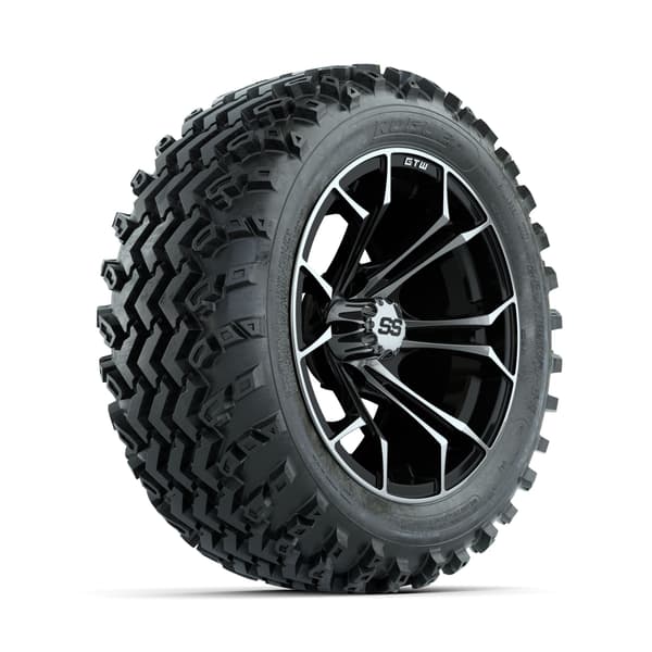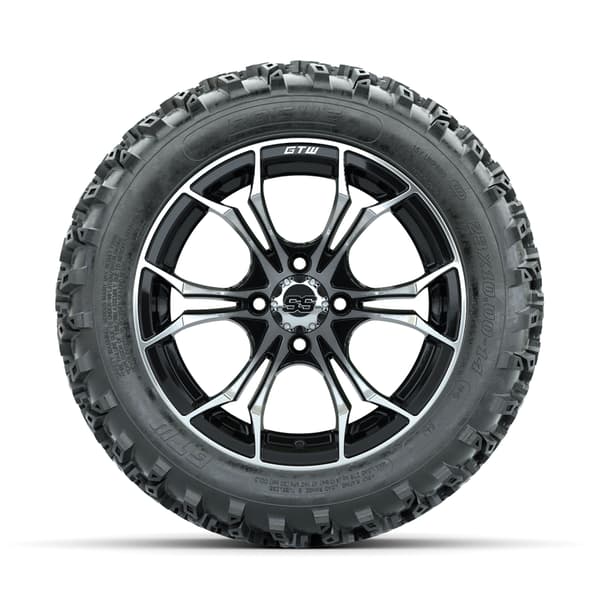 GTW Spyder Machined/Black 14″ wheels with 23×10.00-14 Rogue All-Terrain Tires. Perfect for off-road and rugged terrain. Includes 4 wheels, 4 tires, and center caps. Requires minimum 3” lift kit. 4×101.6mm lug pattern. Tires mounted and inflated before shipping. Lug nuts sold separately.