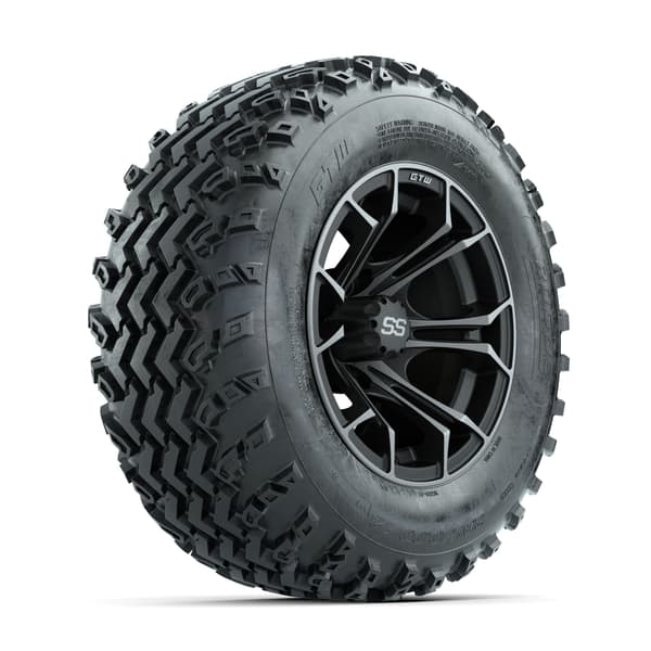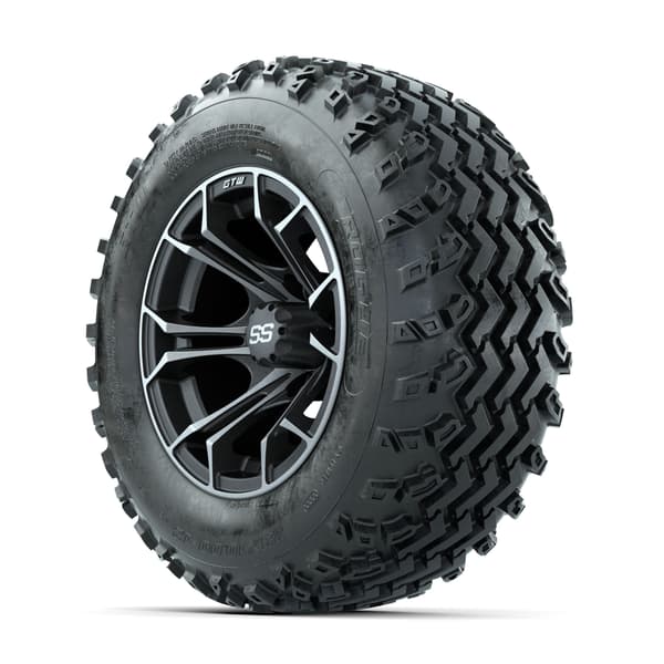 A set of (4) 12-inch GTW® Spyder Machined/Grey golf cart wheels Mounted on 23×10.00-12 Rogue All-Terrain Tires