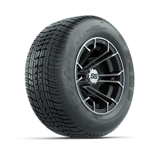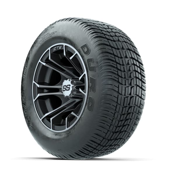 A set of (4) 10-inch GTW® Spyder Machined/Matte Grey golf cart wheels Mounted on 205/50-10 Duro Low-profile Tires