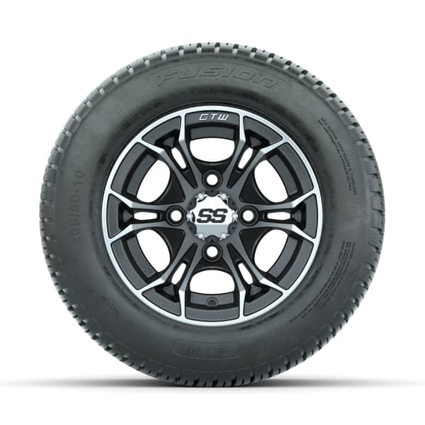 A set of (4) 10-inch GTW® Spyder Machined/Matte Grey golf cart wheels Mounted on 205/50-10 Fusion Street Tires