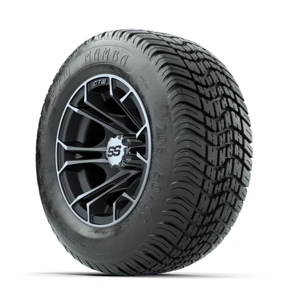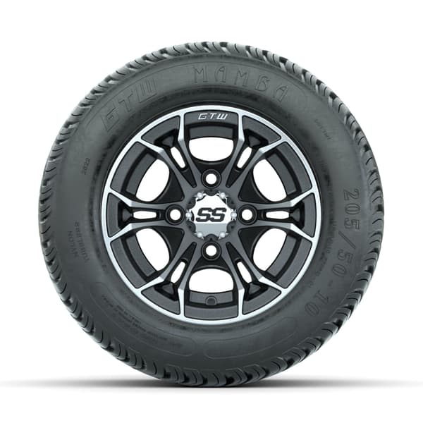 A set of (4) 10-inch GTW® Spyder Machined/Matte Grey golf cart wheels Mounted on 205/50-10 Mamba Street Tires
