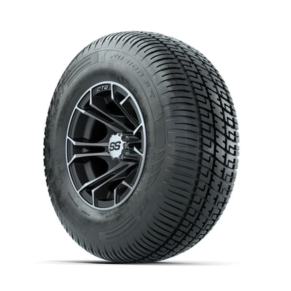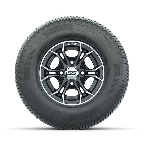 A set of (4) 10-inch GTW® Spyder Machined/Matte Grey golf cart wheels Mounted on 205/65-R10 Fusion SR Steel Belted Radial Tires