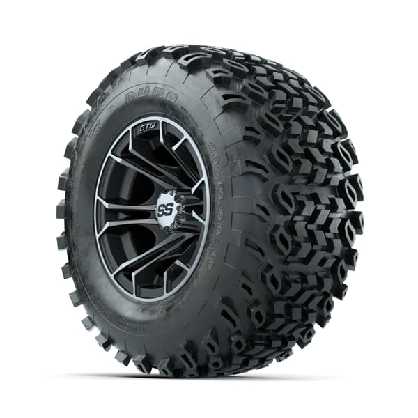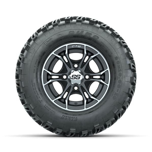 A set of (4) 10-inch GTW® Spyder Machined/Matte Grey golf cart wheels Mounted on 20×10-10 Duro Desert All Terrain Tires