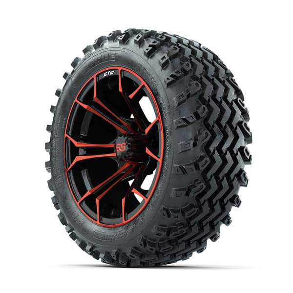 A set of (4) 14-inch GTW® Spyder Red/Black golf cart wheels Mounted on 23×10.00-14 Rogue All-Terrain Tires