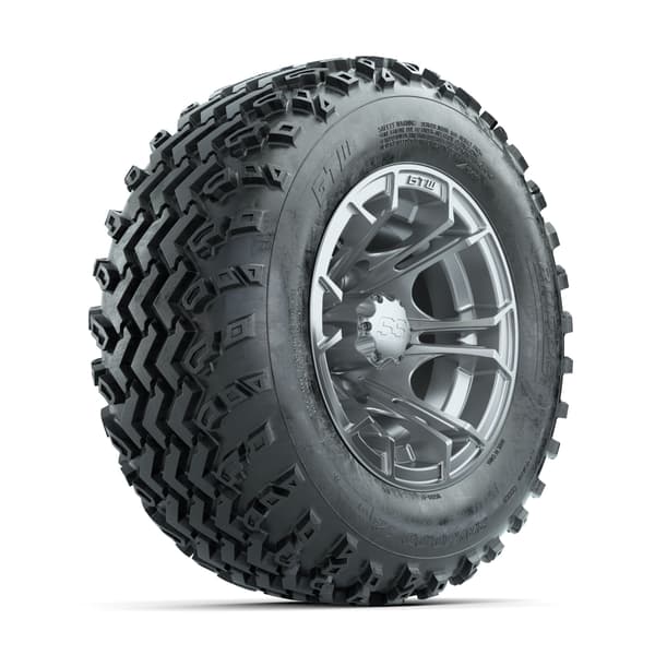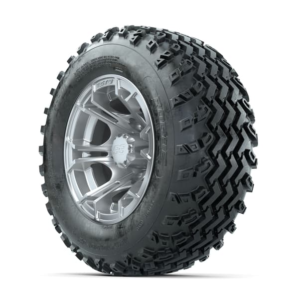 A set of (4) 12-inch GTW® Spyder Silver golf cart wheels Mounted on 23×10.00-12 Rogue All-Terrain Tires