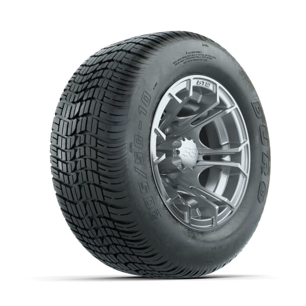 A set of (4) 10-inch GTW® Spyder Silver Brush golf cart wheels Mounted on 205/50-10 Duro Low-profile Tires