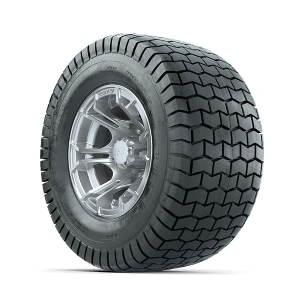 A set of (4) 10-inch GTW® Spyder Silver Brush golf cart wheels Mounted on 20×10-10 Duro Soft Street Tires