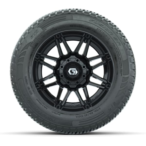 GTW® Stealth Gloss Black 12″ wheels with 215/50-R12 Fusion S/R steel-belted radial tires. This complete street set includes four 4-ply tires, color-matched caps, and a sleek design for smooth, high-performance on-road use. Lug nuts sold separately.
