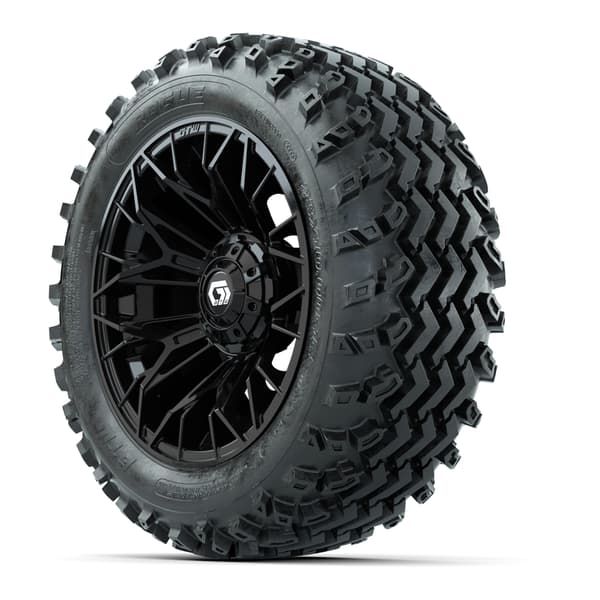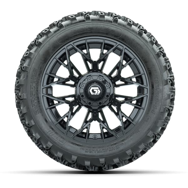 GTW Stellar Black 14″ wheels with 23×10.00-14 Rogue All-Terrain Tires. Ideal for off-road and rugged terrain. Includes 4 wheels, 4 tires, and center caps. Requires minimum 3” lift kit. 4×101.6mm lug pattern. Tires mounted and inflated before shipping. Lug nuts sold separately.
