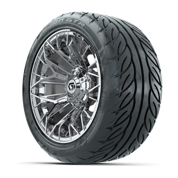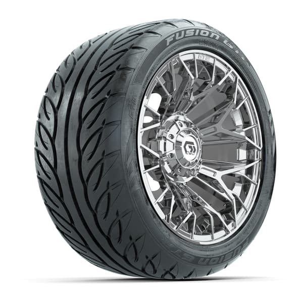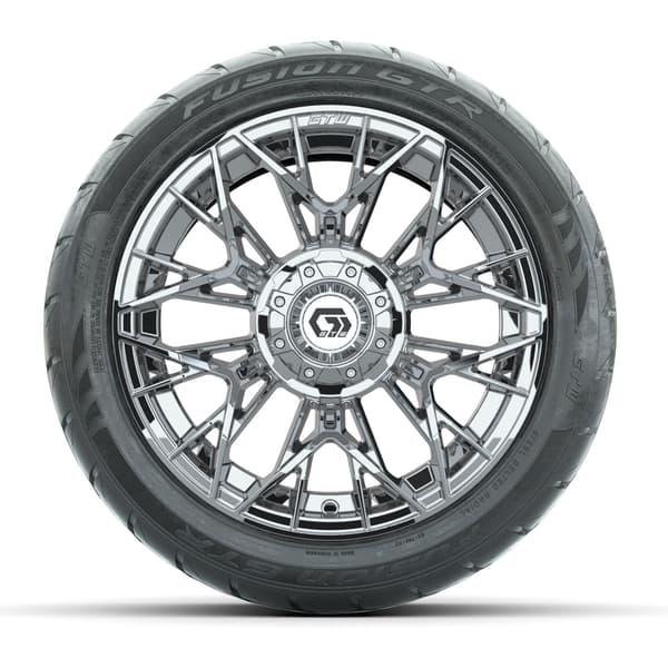 A set of (4) 14-inch GTW® Stellar Chrome golf cart wheels Mounted on 225/40-R14 GTW® Fusion GTR Steel Belted Street Tires