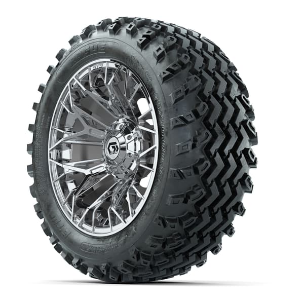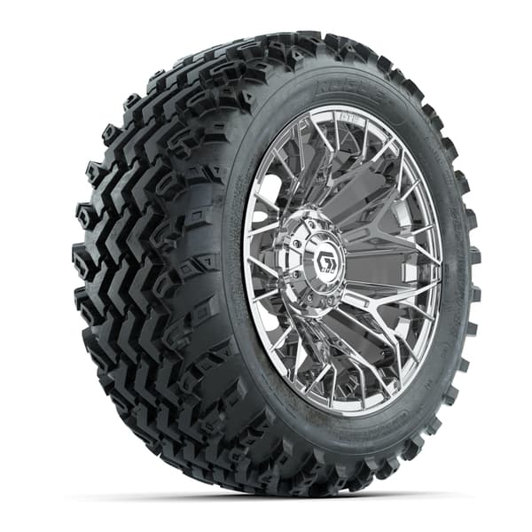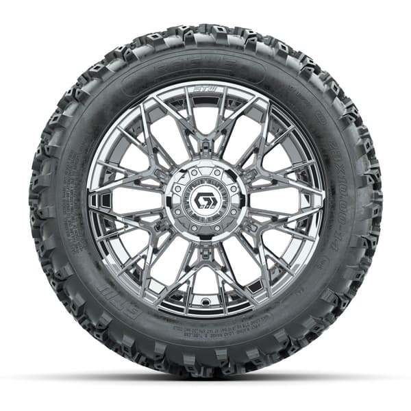GTW Stellar Chrome 14″ wheels with 23×10.00-14 Rogue All-Terrain Tires. Ideal for off-road and rugged use. Includes 4 wheels, 4 tires, and center caps. Requires minimum 3” lift kit. 4×101.6mm lug pattern. Tires mounted and inflated before shipping. Lug nuts sold separately.