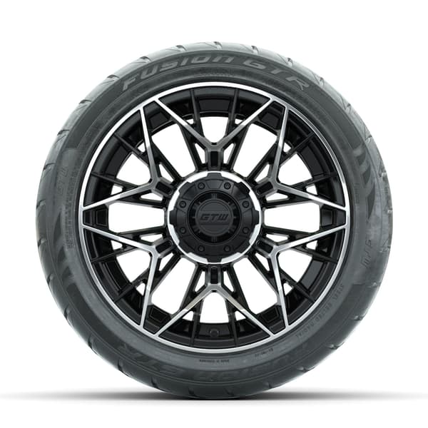 A set of (4) 14-inch GTW® Stellar Machined/Black golf cart wheels Mounted on 225/40-R14 GTW® Fusion GTR Steel Belted Street Tires