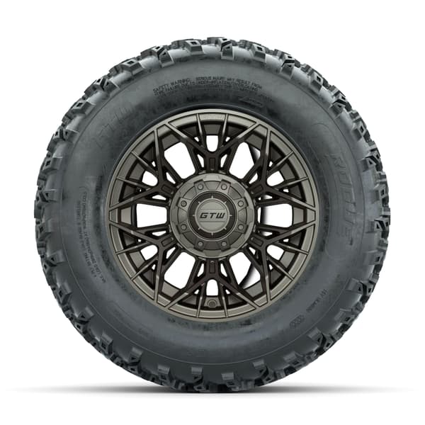 A set of (4) 12-inch GTW® Stellar Matte Bronze golf cart wheels Mounted on 23×10.00-12 Rogue All-Terrain Tires