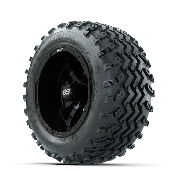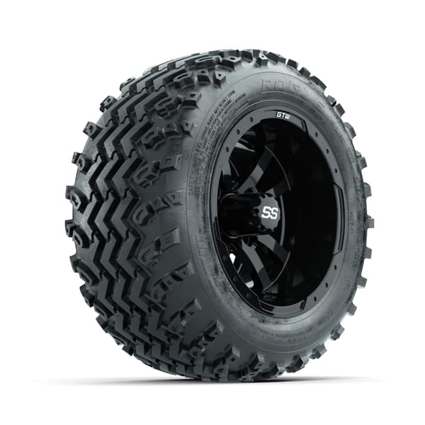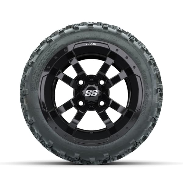 A set of (4) 10-inch GTW® Storm Trooper Black golf cart wheels Mounted on 18×9.50-10 Rogue All-Terrain Tires