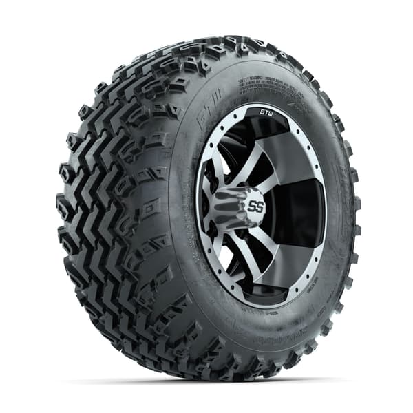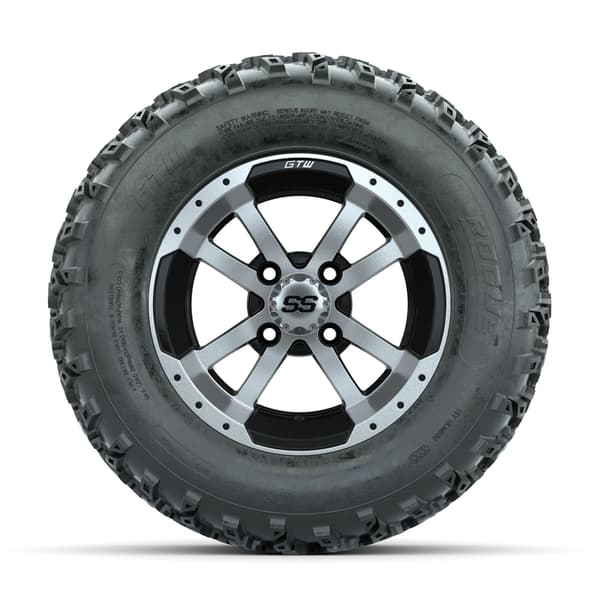 A set of (4) 12-inch GTW® Storm Trooper Machined/Black golf cart wheels Mounted on 23×10.00-12 Rogue All-Terrain Tires