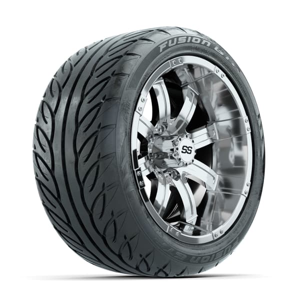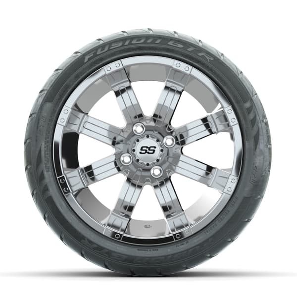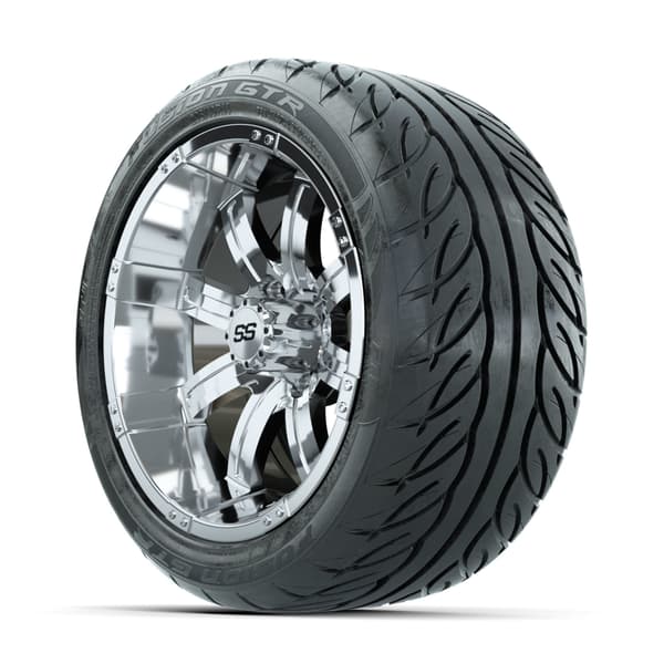 A set of (4) 14-inch GTW® Tempest Chrome golf cart wheels Mounted on 225/40-R14 GTW® Fusion GTR Steel Belted Street Tires