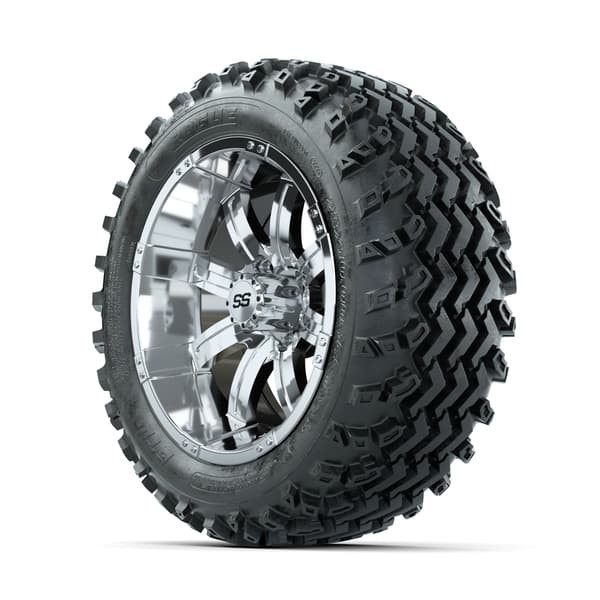 A set of (4) 14-inch GTW® Tempest Chrome golf cart wheels Mounted on 23×10.00-14 Rogue All-Terrain Tires