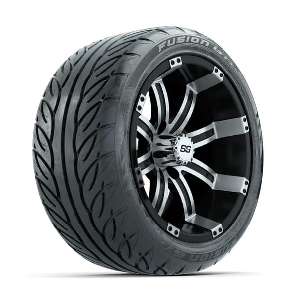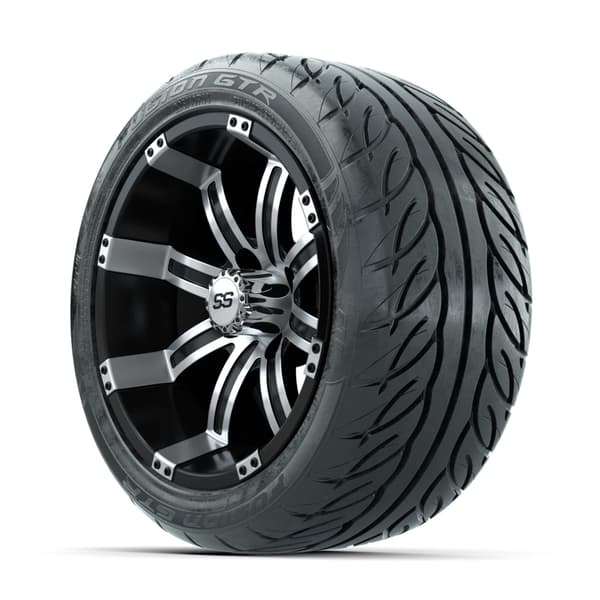 A set of (4) 14-inch GTW® Tempest Machined/Black golf cart wheels Mounted on 225/40-R14 GTW® Fusion GTR Steel Belted Street Tires