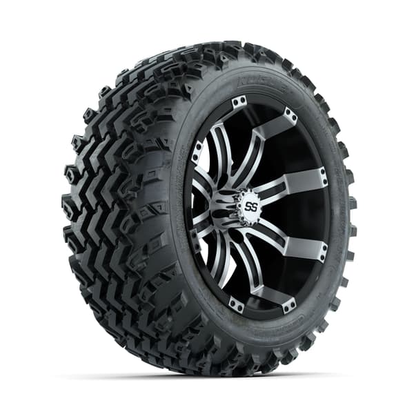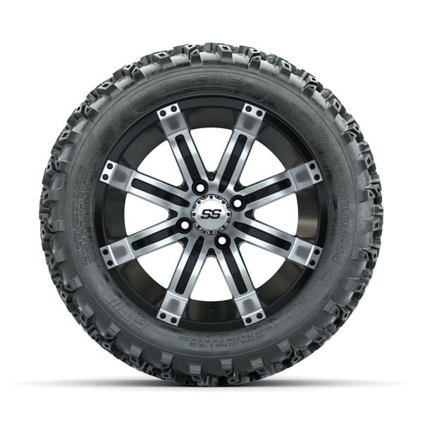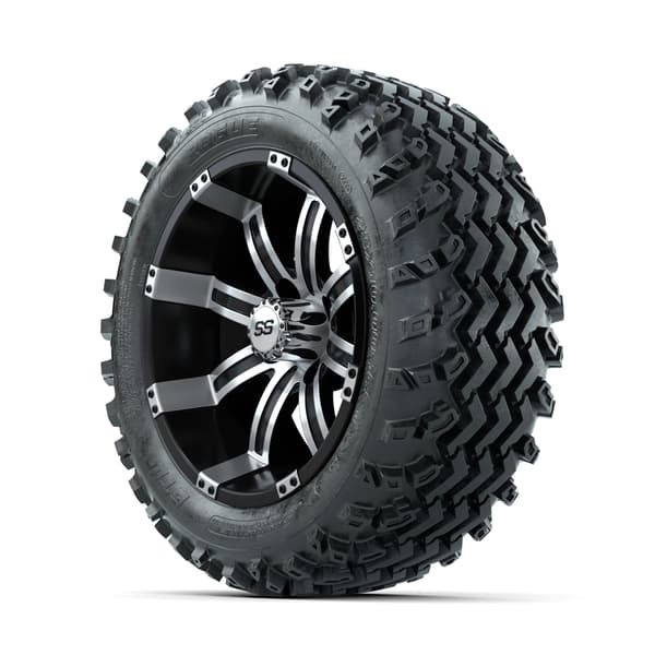 A set of (4) 14-inch GTW® Tempest Machined/Black golf cart wheels Mounted on 23×10.00-14 Rogue All-Terrain Tires