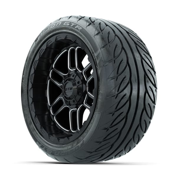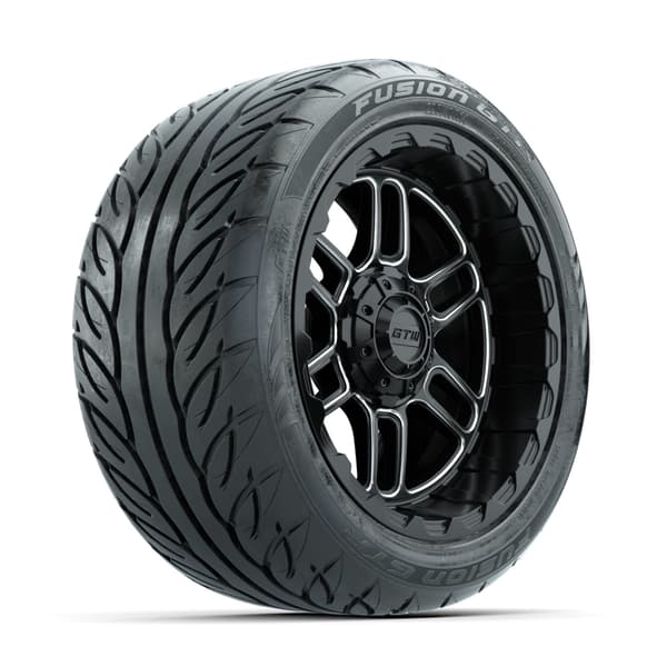 A set of (4) 14-inch GTW® Titan Machined/Black golf cart wheels Mounted on 225/40-R14 GTW® Fusion GTR Steel Belted Street Tires