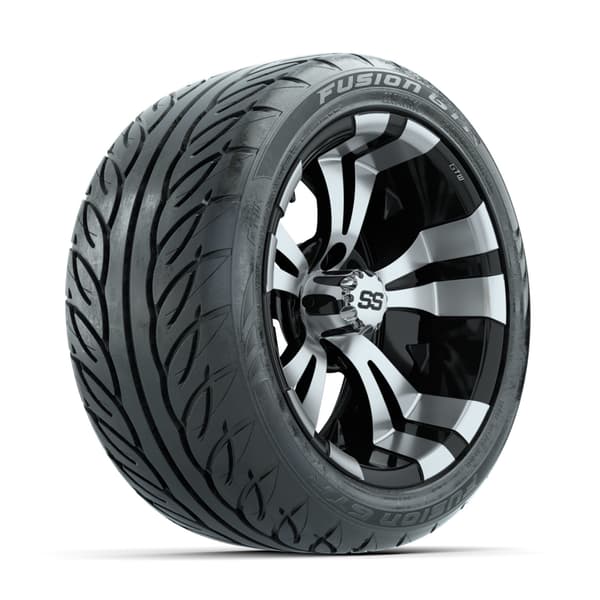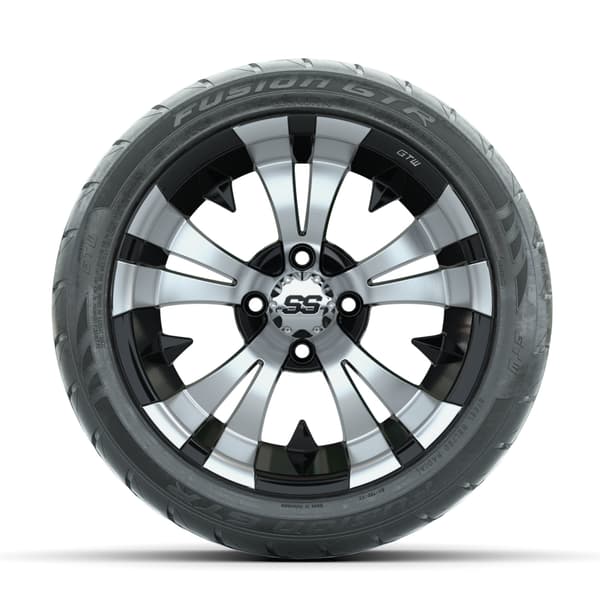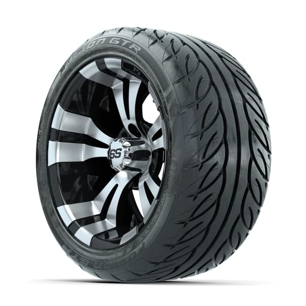 A set of (4) 14-inch GTW® Vampire Machined/Black golf cart wheels Mounted on 225/40-R14 GTW® Fusion GTR Steel Belted Street Tires