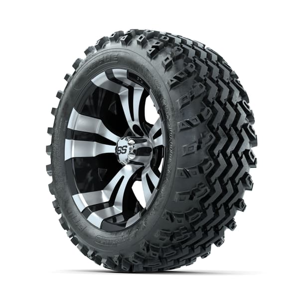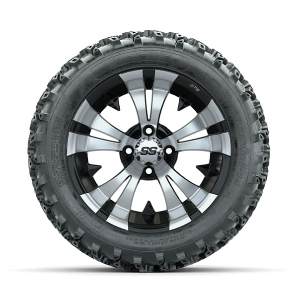 GTW Vampire Machined/Black 14″ wheels with 23×10.00-14 Rogue All-Terrain Tires. Perfect for off-road and rugged terrain. Includes 4 wheels, 4 tires, and center caps. Requires minimum 3” lift kit. 4×101.6mm lug pattern. Tires mounted and inflated before shipping. Lug nuts sold separately.